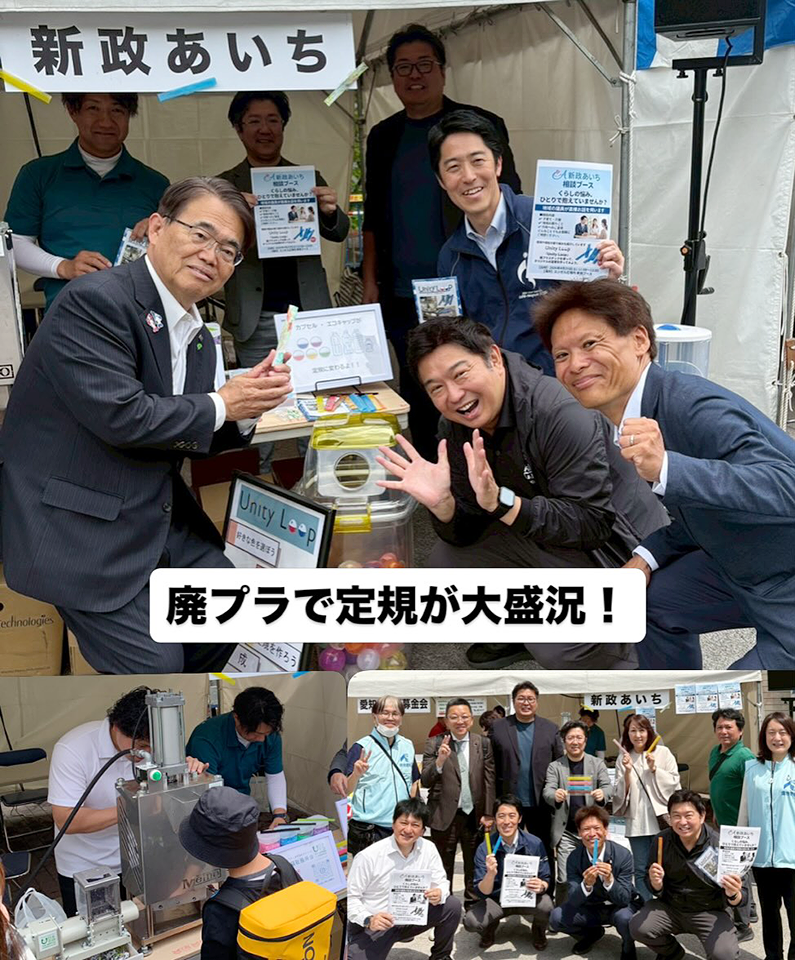 県下自治体議員約150名が所属する「新政あいち」として出展、今回は議員が直接くらしの相談を受けるコーナーに併せて廃プラリサイクルの企画を実施。
